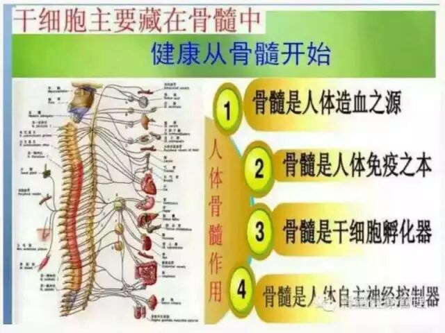 通过人体脊柱骨髓剖面图,可以清晰的看到人体所有脏器组织都由神经和血管连接在骨髓上。脊柱骨髓上有31对凸起的小刺,这就是31对自主神经连接着人体的各个脏器组织。骨髓造血,养育着人体各个器官组织及全身。所以人体器官组织的年轻健康与否,来源于骨髓。